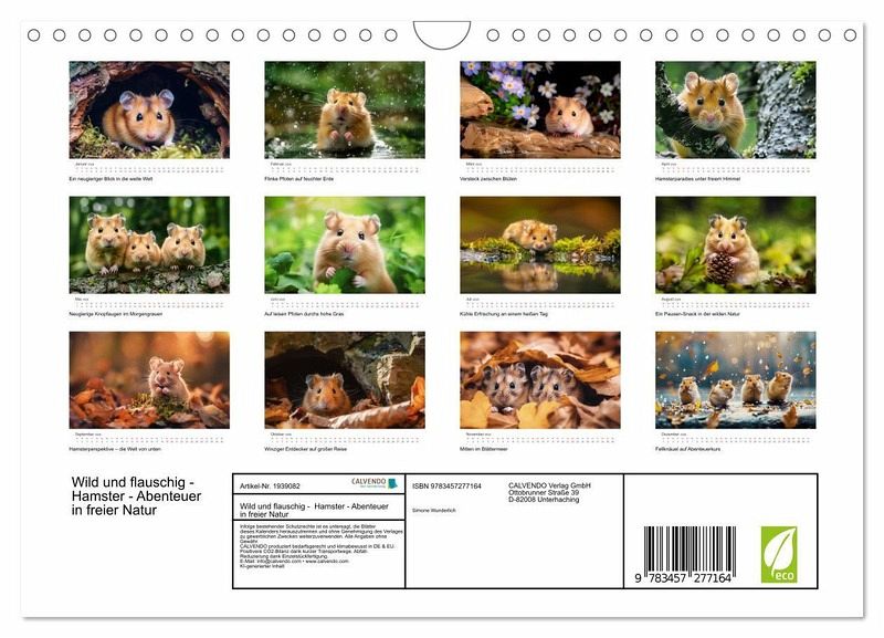 QUALITÄT - Hochwertiger Fotokalender mit 12 wunderschönen Motiven auf lichtbeständigem Bilderdruckpapier, robuste Spiralbindung mit Aufhängebügel.NACHHALTIG - deutliche Abfallreduzierung durch bedarfsgerechte Einzelstückfertigung, umweltfreundliches FSC-zertifiziertes Papier, Produktion in Deutschland, klimabewusste Logistik.PERFEKTES GESCHENK - Kalender für Freunde und Familie, für Kinder und Erwachsene, jung und alt, zu Weihnachten, Geburtstag oder zwischendurch.VIELFALT - Bildkalender in verschiedenen Formaten, z.B. DIN A5, DIN A4, DIN A3 sowie DIN A2. Ob Naturmotiv, Gemälde oder Fotos, ideal für ein persönliches Wohlfühlambiente.Mit süßen Hamstern durchs Jahr! von Autor(in): Simone Wunderlich