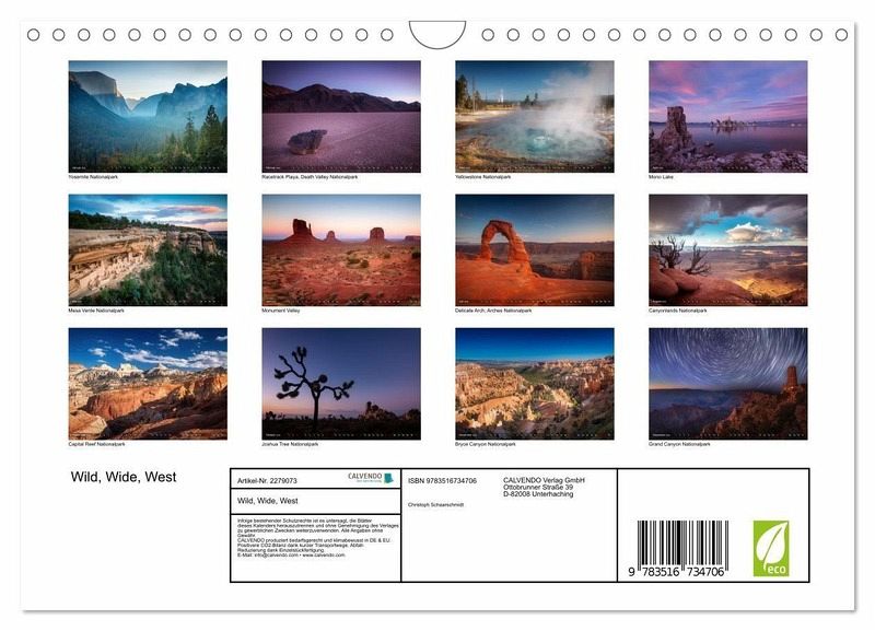 Wild, Wide, West - eine fotografische Hommage an die ungezähmte Schönheit des amerikanischen Westens. Der Fotograf Christoph Schaarschmidt nimmt Sie mit auf eine eindrucksvolle Reise durch einige der spektakulärsten Landschaften der Erde: von den mächtigen Felsen des Yosemite Nationalparks über die dampfenden Quellen im Yellowstone, die filigranen Steinbögen des Arches Nationalparks bis zu den endlosen Weiten des Grand Canyon. Auch das legendäre Monument Valley und das geheimnisvolle Phänomen der "wandernden Steine" im Death Valley finden ihren Platz in dieser Sammlung. Jeder Monat zeigt ein neues Panorama voller Licht, Weite und Wildnis - eine Einladung, den Zauber des Westens immer wieder neu zu entdecken.
