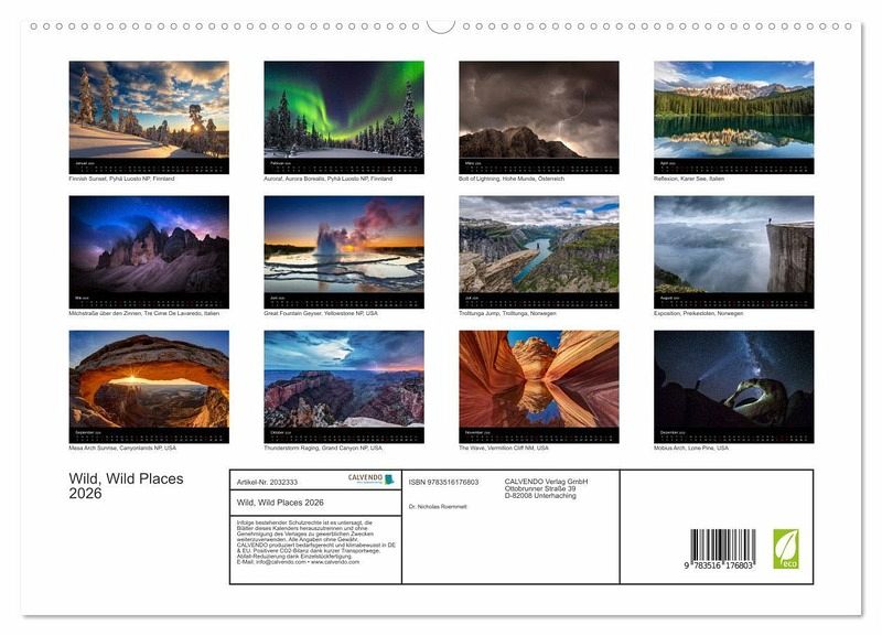 PREMIUM-LINIE - Brillanter Fotokalender mit 12 wunderschönen Motiven, Kunstdruck in Hochglanz in Museumsqualität.QUALITÄT - edle Materialien, stabile Rückwand mit 2 innovativen Einstecktaschen für eine optimale Präsentation an der Wand.NACHHALTIG - deutliche Abfallreduzierung durch bedarfsgerechte Einzelstückfertigung, umweltfreundliches FSC-zertifiziertes Papier, Produktion in Deutschland, klimabewusste Logistik.PERFEKTES GESCHENK - Kalender für Freunde und Familie, für Kinder und Erwachsene, jung und alt, zu Weihnachten, Geburtstag oder zwischendurch.Die wilden Plätze der Erde von Autor(in): Nicholas Roemmelt