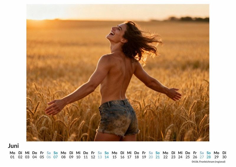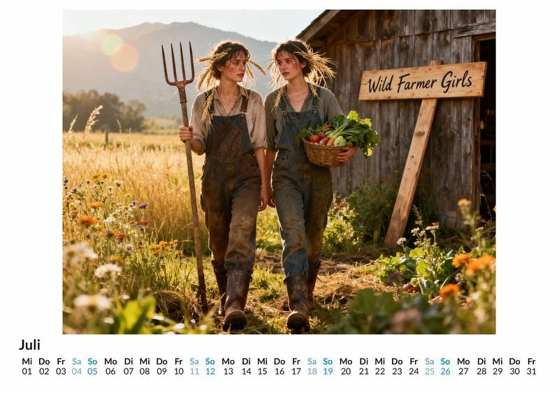 Einleitung Golden leuchten die Kornfelder unter der Sommersonne, eine Kulisse für eine besondere Art von Landleben. Der Kalender "Wilde Bäuerinnen" fängt Momente ein, in denen sich ungezähmte Natur und weibliche Anmut verbinden. Er zelebriert eine Ästhetik, die sowohl natürlich als auch bewusst gestaltet ist und den Betrachter durch ein ganzes Jahr begleitet. Für wen ist dieser Kalender? * Für Liebhaber ästhetischer Darstellungen mit einem freizügigen Akzent. * Für Menschen, die die Verbindung von ländlicher Idylle und weiblicher Schönheit schätzen. * Für Sammler von Kalendern, die das Besondere suchen und sich von neuen visuellen Konzepten inspirieren lassen wollen. Ein Jahr im Zeichen der Ernte Zwölf Monate, zwölf einzigartige Szenen, die eine Geschichte von Sommer, Freiheit und dem Leben auf dem Land erzählen. Im Mittelpunkt stehen Frauen, selbstbewusst und natürlich, in nassen, weißen T-Shirts, die locker über dem Bauch geknotet sind. Jedes einzelne Motiv wurde durch die Kraft digitaler Algorithmen zum Leben erweckt und erschafft eine Welt, die real und doch verträumt wirkt. Die warmen Farben des reifen Korns und das Spiel von Licht und Schatten schaffen eine unverwechselbare Stimmung. Was der Kalender bietet * Zwölf unterschiedliche Monatsmotive zum Thema "Wilde Bäuerinnen". * Ein übersichtliches Kalendarium, das den Motiven genügend Raum lässt. * Einen Wandkalender, der das ganze Jahr über einen visuellen Akzent setzt. Ein Blickfang für das ganze Jahr Der Kalender "Wilde Bäuerinnen" ist eine Komposition aus ländlicher Romantik und moderner Bildsprache. Eine Einladung, die zwölf Motive zu entdecken und sich von ihrer besonderen Ausstrahlung durch das Jahr begleiten zu lassen.