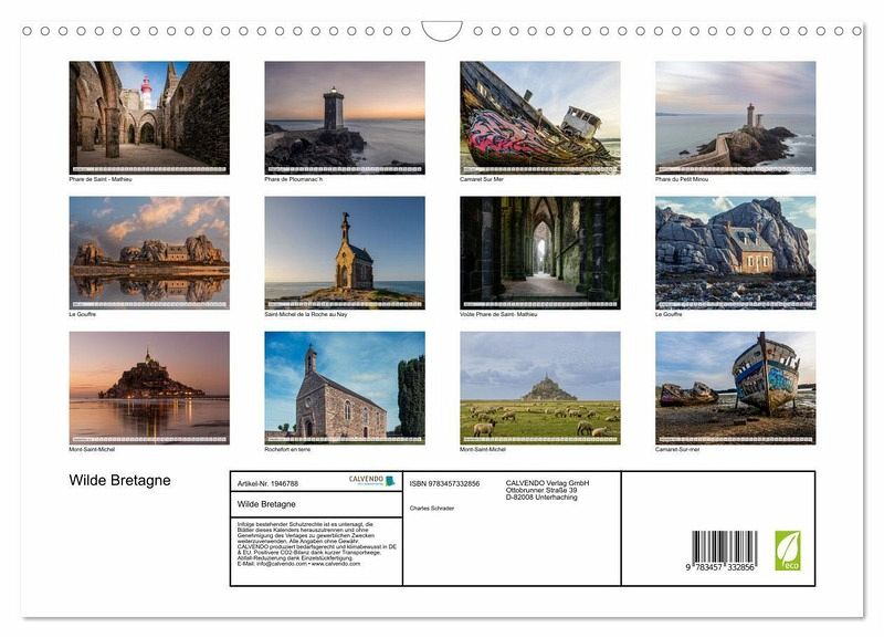 Entdecken Sie die raue Schönheit der Bretagne in unserem exklusiven Fotokalender! Tauchen Sie ein in das Spiel von Wind, Wellen und Felsenküsten, die Geschichten von Ursprünglichkeit und Freiheit erzählen. Jeder Monat enthüllt atemberaubende Landschaften - von zerklüfteten Klippen über mystische Wälder bis hin zu einsamen Leuchttürmen. Lassen Sie sich von den eindrucksvollen Bildern der wilden Bretagne verzaubern und holen Sie sich ein Stück unberührte Natur nach Hause. Perfekt für alle, die die Sehnsucht nach Abenteuer und die Kraft der Natur lieben. Einzigartige Fotos für alle Liebhaber der Bretagne und die, die es werden wollen.