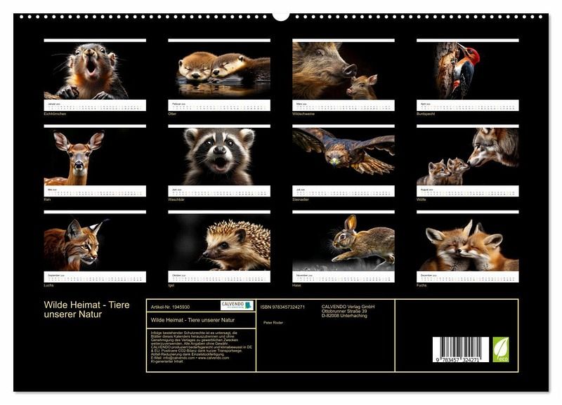 Tauchen Sie ein in die faszinierende Welt unserer heimischen Waldbewohner. Wildschweine, Rehe, Füchse, Waschbären oder Igel - diese scheuen und oft ungesehenen Tiere durchstreifen still die Wälder, in denen wir spazieren, bleiben aber meist unbemerkt. Mit diesem Kalender holen Sie sich die majestätische Ruhe und das geheimnisvolle Leben des Waldes direkt in Ihr Zuhause. Der Fotokünstler Peter Roder hat es geschafft, die Magie dieser Tiere in einzigartigen KI-basierten Bildern festzuhalten. Jede Seite des Kalenders ist eine Hommage an die Geschöpfe, die den Wald genauso prägen wie die Bäume und Pflanzen. Dieser Kalender ist ein Muss für Naturliebhaber, Tierfreunde und alle, die die stille Schönheit der Natur schätzen. Lassen Sie sich Monat für Monat von den Waldbewohnern verzaubern.