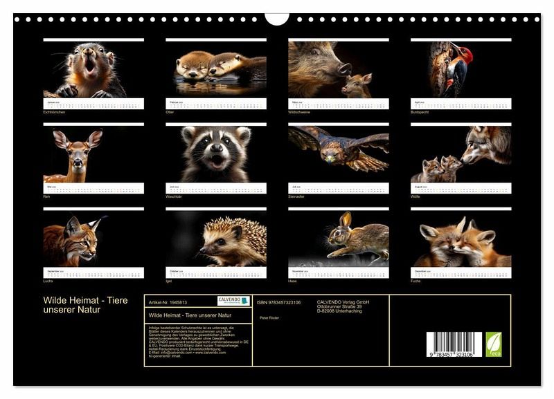 Tauchen Sie ein in die faszinierende Welt unserer heimischen Waldbewohner. Wildschweine, Rehe, Füchse, Waschbären oder Igel - diese scheuen und oft ungesehenen Tiere durchstreifen still die Wälder, in denen wir spazieren, bleiben aber meist unbemerkt. Mit diesem Kalender holen Sie sich die majestätische Ruhe und das geheimnisvolle Leben des Waldes direkt in Ihr Zuhause. Der Fotokünstler Peter Roder hat es geschafft, die Magie dieser Tiere in einzigartigen KI-basierten Bildern festzuhalten. Jede Seite des Kalenders ist eine Hommage an die Geschöpfe, die den Wald genauso prägen wie die Bäume und Pflanzen. Dieser Kalender ist ein Muss für Naturliebhaber, Tierfreunde und alle, die die stille Schönheit der Natur schätzen. Lassen Sie sich Monat für Monat von den Waldbewohnern verzaubern.
