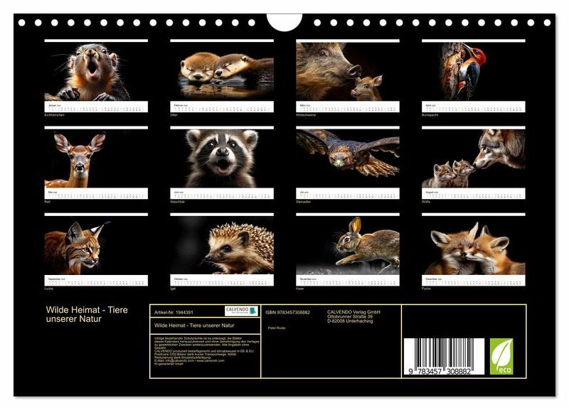 Tauchen Sie ein in die faszinierende Welt unserer heimischen Waldbewohner. Wildschweine, Rehe, Füchse, Waschbären oder Igel - diese scheuen und oft ungesehenen Tiere durchstreifen still die Wälder, in denen wir spazieren, bleiben aber meist unbemerkt. Mit diesem Kalender holen Sie sich die majestätische Ruhe und das geheimnisvolle Leben des Waldes direkt in Ihr Zuhause. Der Fotokünstler Peter Roder hat es geschafft, die Magie dieser Tiere in einzigartigen KI-basierten Bildern festzuhalten. Jede Seite des Kalenders ist eine Hommage an die Geschöpfe, die den Wald genauso prägen wie die Bäume und Pflanzen. Dieser Kalender ist ein Muss für Naturliebhaber, Tierfreunde und alle, die die stille Schönheit der Natur schätzen. Lassen Sie sich Monat für Monat von den Waldbewohnern verzaubern.