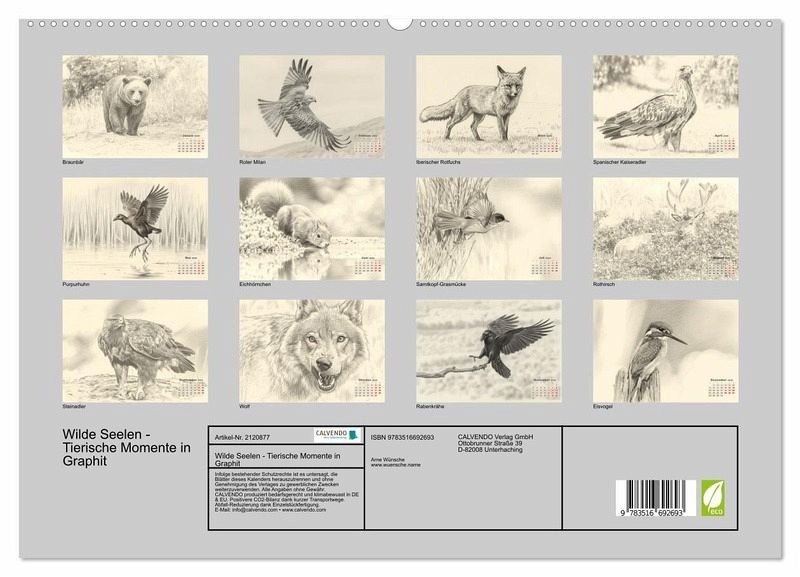 Dieser Kalender präsentiert zwölf sorgfältig ausgewählte Graphitzeichnungen von Tierportraits, die die einzigartige Schönheit und den Charakter verschiedener Wildtiere einfangen. Jedes Blatt ist ein Beweis für die Kraft des Graphits, Licht und Schatten zu nutzen, um tiefe Emotionen und eine fast schon fotorealistische Präsenz zu schaffen. Ein Muss für alle Kunst- und Tierliebhaber.