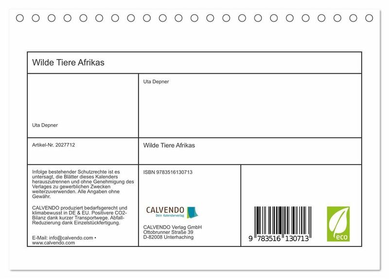 QUALITÄT - Hochwertiger Fotokalender mit 12 wunderschönen Motiven auf lichtbeständigem Bilderdruckpapier, robuste Spiralbindung.NACHHALTIG - deutliche Abfallreduzierung durch bedarfsgerechte Einzelstückfertigung, umweltfreundliches FSC-zertifiziertes Papier, Produktion in Deutschland, klimabewusste Logistik.PERFEKTES GESCHENK - Kalender für Freunde und Familie, für Kinder und Erwachsene, jung und alt, zu Weihnachten, Geburtstag oder zwischendurch.VIELFALT - Bildkalender in verschiedenen Formaten, z.B. DIN A5, DIN A4, DIN A3 sowie DIN A2. Ob Naturmotiv, Gemälde oder Fotos, ideal für ein persönliches Wohlfühlambiente.Wildtiere Afrikas hautnah erleben von Autor(in): Uta Depner
