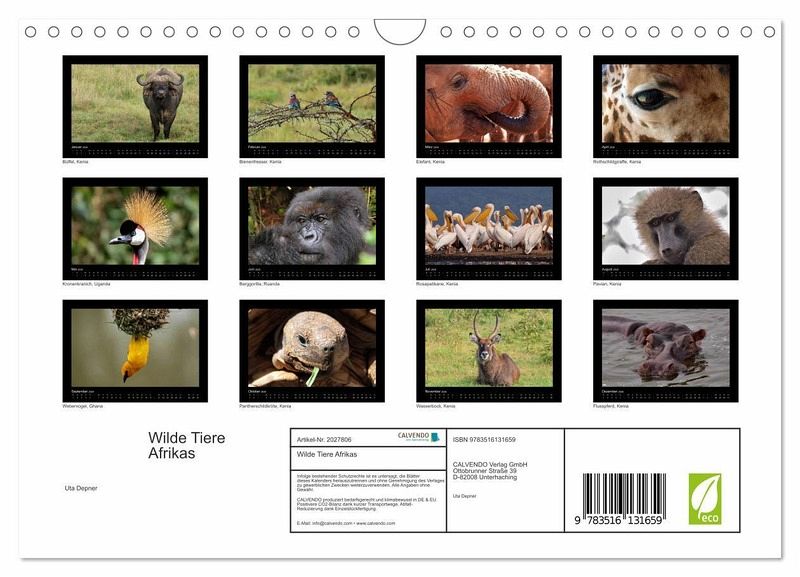 QUALITÄT - Hochwertiger Fotokalender mit 12 wunderschönen Motiven auf lichtbeständigem Bilderdruckpapier, robuste Spiralbindung mit Aufhängebügel.NACHHALTIG - deutliche Abfallreduzierung durch bedarfsgerechte Einzelstückfertigung, umweltfreundliches FSC-zertifiziertes Papier, Produktion in Deutschland, klimabewusste Logistik.PERFEKTES GESCHENK - Kalender für Freunde und Familie, für Kinder und Erwachsene, jung und alt, zu Weihnachten, Geburtstag oder zwischendurch.VIELFALT - Bildkalender in verschiedenen Formaten, z.B. DIN A5, DIN A4, DIN A3 sowie DIN A2. Ob Naturmotiv, Gemälde oder Fotos, ideal für ein persönliches Wohlfühlambiente.Wildtiere Afrikas hautnah erleben von Autor(in): Uta Depner