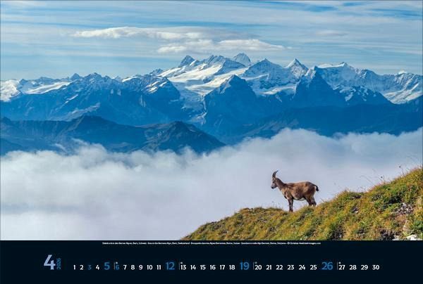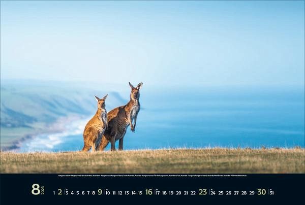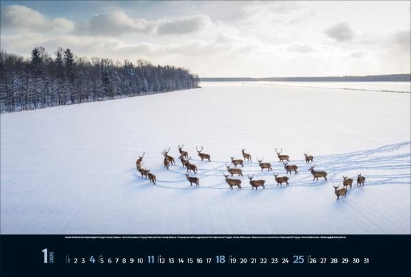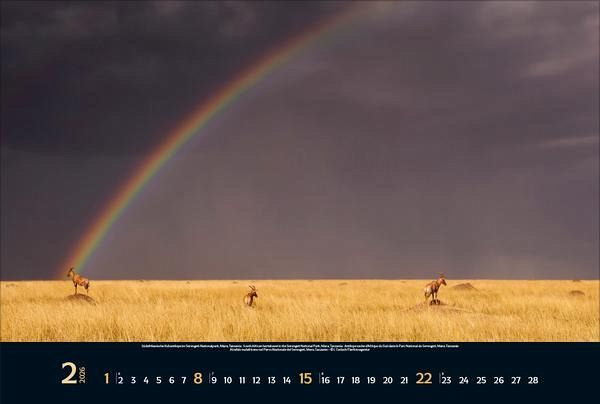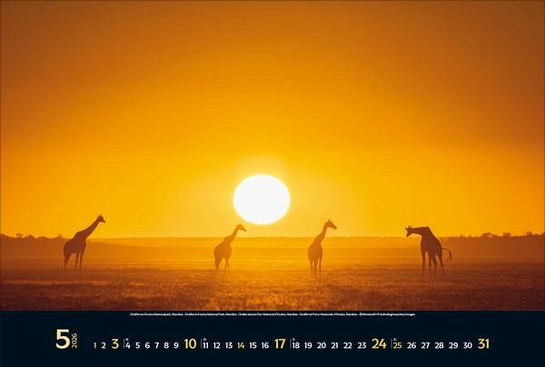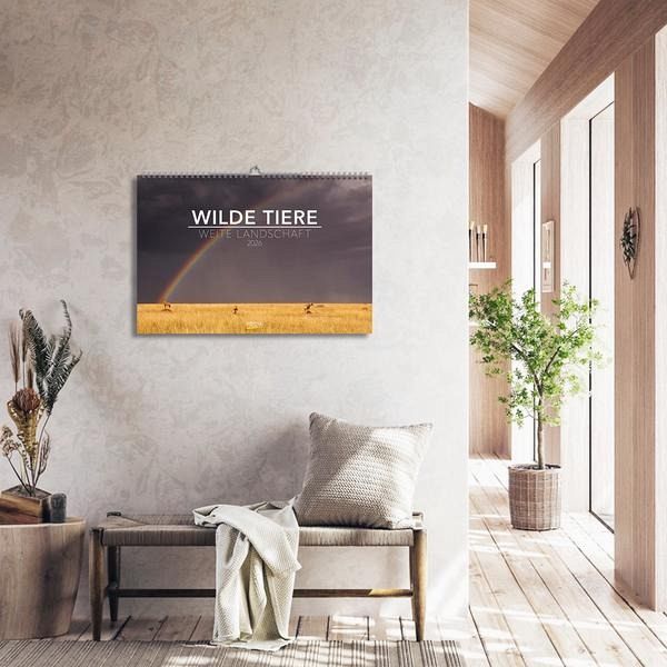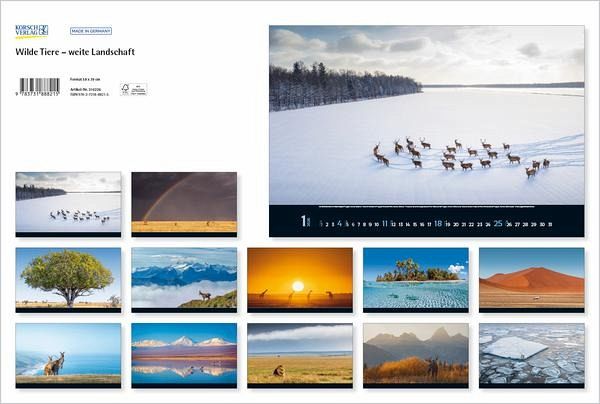 Die atemberaubenden Landschaften wirken in diesem Kalender besonders eindrucksvoll, da die Tiere nur einen kleineren Teil des Motivs einnehmen. Zwölf beeindruckende Fotografien von weiten Landschaften und wilden Tieren schaffen einen einzigartigen Wandschmuck.