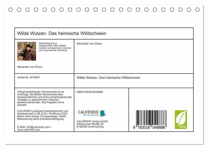 QUALITÄT - Hochwertiger Fotokalender mit 12 wunderschönen Motiven auf lichtbeständigem Bilderdruckpapier, robuste Spiralbindung.NACHHALTIG - deutliche Abfallreduzierung durch bedarfsgerechte Einzelstückfertigung, umweltfreundliches FSC-zertifiziertes Papier, Produktion in Deutschland, klimabewusste Logistik.PERFEKTES GESCHENK - Kalender für Freunde und Familie, für Kinder und Erwachsene, jung und alt, zu Weihnachten, Geburtstag oder zwischendurch.VIELFALT - Bildkalender in verschiedenen Formaten, z.B. DIN A5, DIN A4, DIN A3 sowie DIN A2. Ob Naturmotiv, Gemälde oder Fotos, ideal für ein persönliches Wohlfühlambiente.Das Wildschwein (Sus scrofa) ganz nah und in intimen Bildern von Autor(in): Alexander von Düren