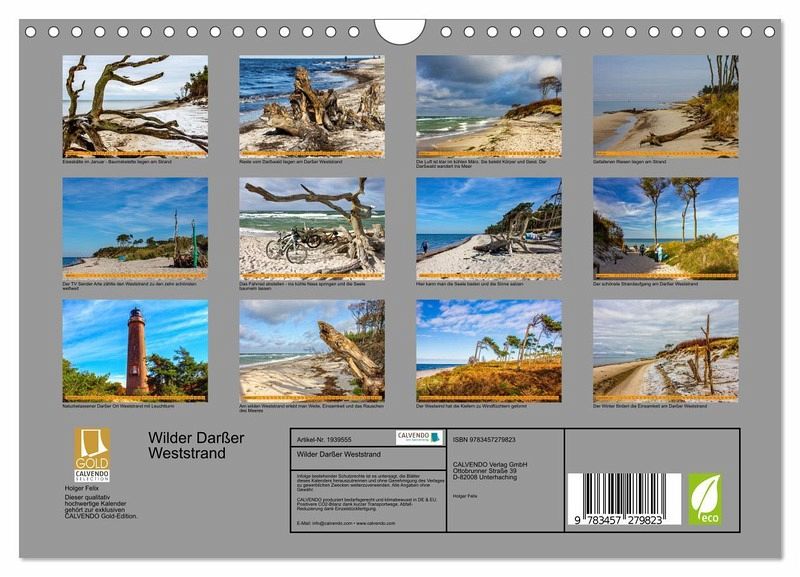"Dieser qualitativ hochwertige Kalender gehört zur exklusiven CALVENDO Gold-Edition." Der wilde Darßer Weststrand ist ein wahrhaft beeindruckender Ort an der Mecklenburg-Vorpommerschen Ostseeküste. Er erstreckt sich nordwestlich von Ahrenshoop bis zum nördlichsten Punkt der Halbinsel Fischland-Darß-Zingst, dem Darßer Ort. Dieser feinsandige Strand, der an den Darßwald grenzt, bietet auf etwa vierzehn Kilometern Länge eine reizvolle Verbindung von maritim geprägter Atmosphäre mit urwüchsiger Natürlichkeit. Der Weststrand wurde sogar vom Fernsehsender ARTE zu einem der 20 schönsten Strände weltweit gekürt. Trotz seiner abgeschiedenen Lage ist der Weststrand nicht völlig einsam. Hier finden Sie Naturverbundene, die die wilde Schönheit und Romantik dieses Ortes zu schätzen wissen.