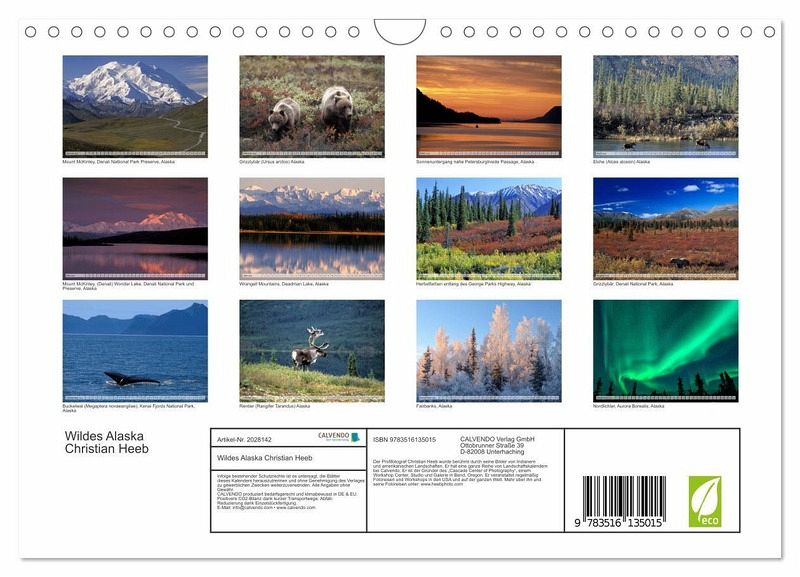 QUALITÄT - Hochwertiger Fotokalender mit 12 wunderschönen Motiven auf lichtbeständigem Bilderdruckpapier, robuste Spiralbindung mit Aufhängebügel.NACHHALTIG - deutliche Abfallreduzierung durch bedarfsgerechte Einzelstückfertigung, umweltfreundliches FSC-zertifiziertes Papier, Produktion in Deutschland, klimabewusste Logistik.PERFEKTES GESCHENK - Kalender für Freunde und Familie, für Kinder und Erwachsene, jung und alt, zu Weihnachten, Geburtstag oder zwischendurch.VIELFALT - Bildkalender in verschiedenen Formaten, z.B. DIN A5, DIN A4, DIN A3 sowie DIN A2. Ob Naturmotiv, Gemälde oder Fotos, ideal für ein persönliches Wohlfühlambiente.Landschaftsfotografien von Natur und Wildtieren in Alaska, USA, fotografiert von Christian Heeb. von Autor(in): Christian Heeb