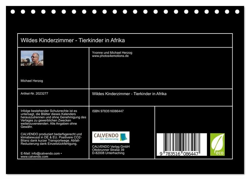 Die Beobachtung von Tierkindern ist für viele von uns besonders faszinierend. Mit ihrer Tapsigkeit, Verspieltheit und Verletzlichkeit berühren sie unser Herz. Michael Herzog nimmt Sie in diesem Kalender mit auf seine Reisen in das wilde Kinderzimmer Ost- und Südafrikas. Mit seinen wundervollen Bildern gibt er einen Einblick in das Leben der Kleinen im Pelz.