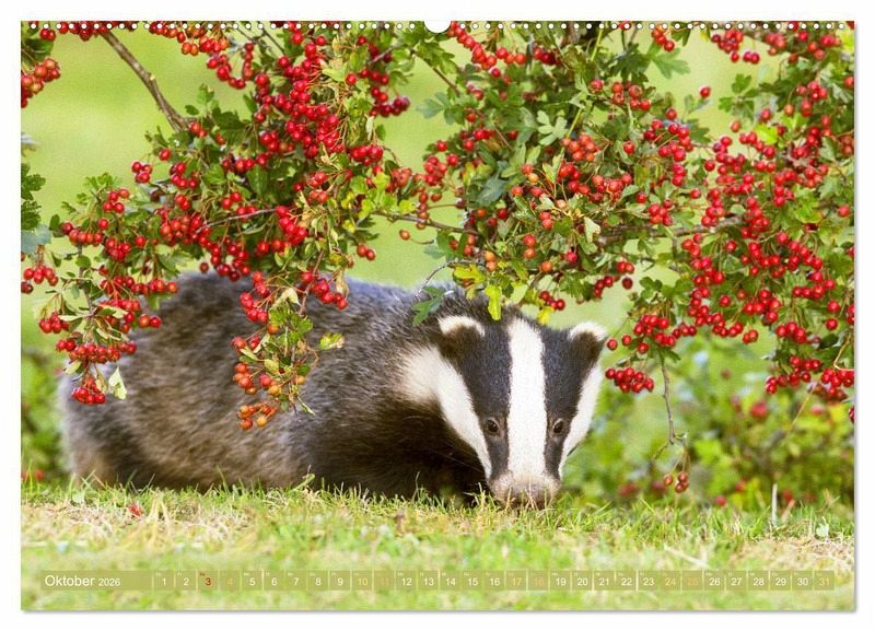 Oktober: Der Dachs (Meles meles), in Fabeln auch Grimbart genannt, bevorzugt pflanzliche Kost, hier die Früchte von einem Weißdorn-Busch