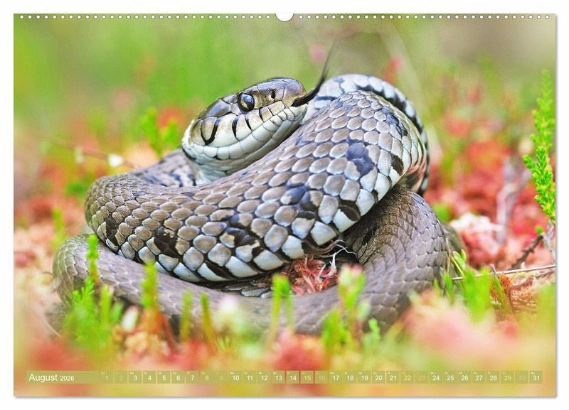 August: Ringelnatter (Natrix natrix), für Menschen völlig ungefährlich, lebt sie in der Nähe von Gewässern und jagt Amphibien