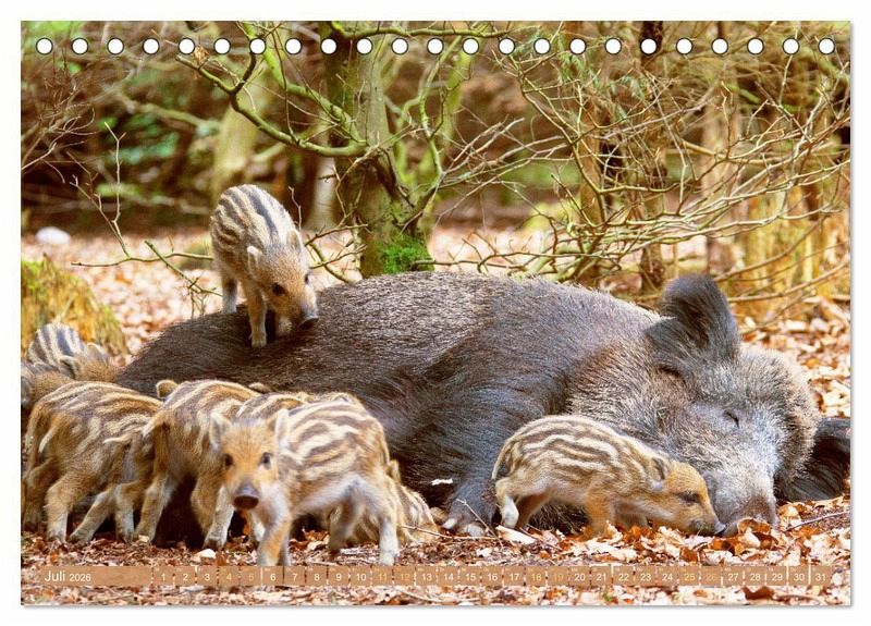 Juli: Wildschwein (Sus scrofa), Frischlinge können bereits unmittelbar nach der Geburt sehen und weisen bereits ein Borstenfell auf
