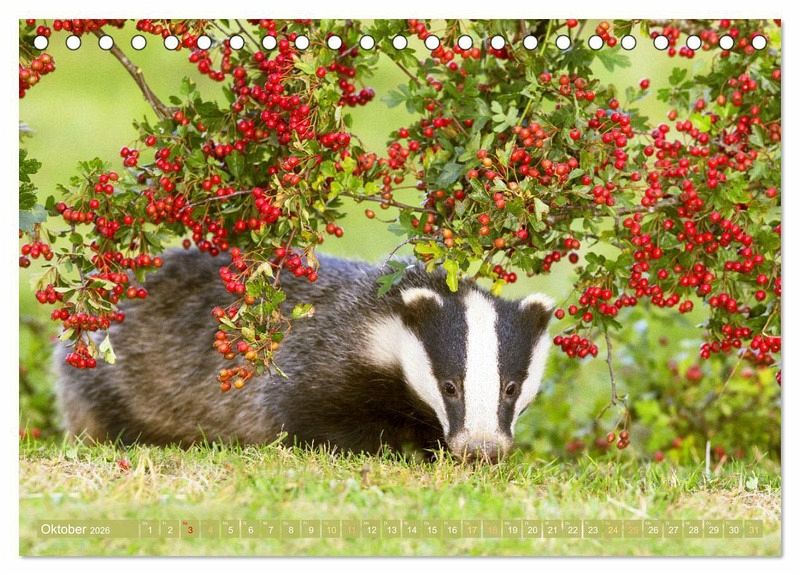 Oktober: Der Dachs (Meles meles), in Fabeln auch Grimbart genannt, bevorzugt pflanzliche Kost, hier die Früchte von einem Weißdorn-Busch