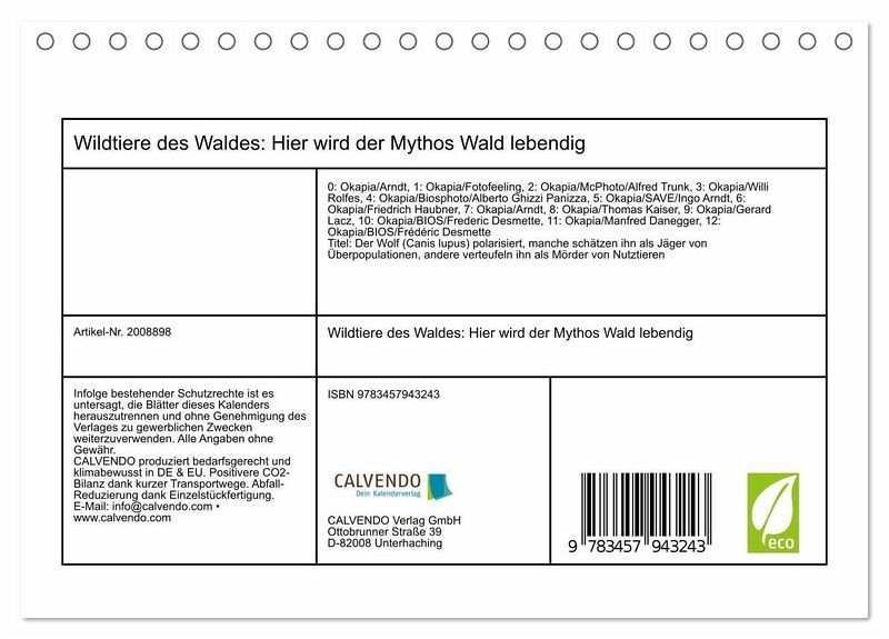 Wald- und Naturschutzgebiete sind sensible Ökosysteme und aufregende Urlaubsattraktion zugleich - keine schlechten Voraussetzungen für den Schutz des Waldes, denn nur was der Mensch kennt, ist er auch bereit zu bewahren. Mit diesem Kalender erlauben wir uns allerdings, Schleiereule, Hermelin, Fischotter, Dachs, Wolf und Hirsch und viele weitere Tiere still zu beobachten, ohne sie in Ihrer natürlichen Umwelt zu stören.