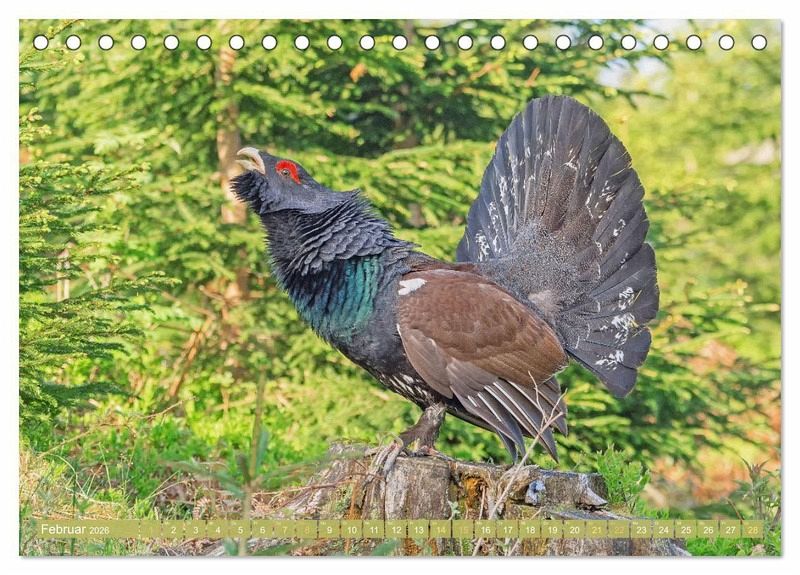 Februar: Auerhahn (Tetrao urogallus), bei der Balz: gefächerter, steil aufgerichteter Schwanz, hochgereckter Kopf und der weithin hörbare Balzgesang