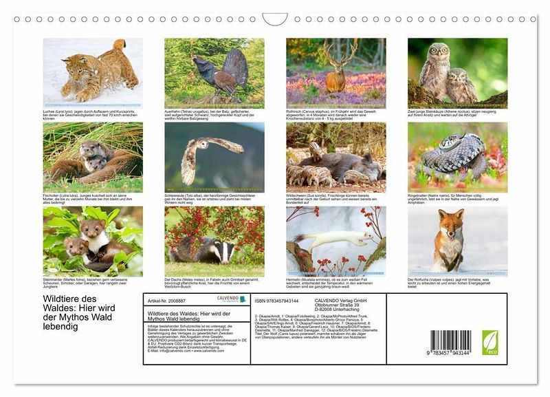 Wald- und Naturschutzgebiete sind sensible Ökosysteme und aufregende Urlaubsattraktion zugleich - keine schlechten Voraussetzungen für den Schutz des Waldes, denn nur was der Mensch kennt, ist er auch bereit zu bewahren. Mit diesem Kalender erlauben wir uns allerdings, Schleiereule, Hermelin, Fischotter, Dachs, Wolf und Hirsch und viele weitere Tiere still zu beobachten, ohne sie in Ihrer natürlichen Umwelt zu stören.