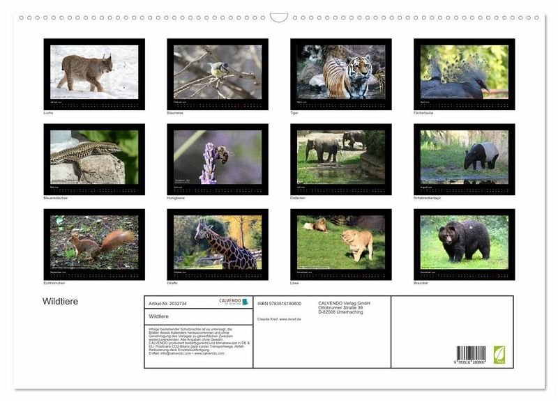 QUALITÄT - Hochwertiger Fotokalender mit 12 wunderschönen Motiven auf lichtbeständigem Bilderdruckpapier, robuste Spiralbindung mit Aufhängebügel.NACHHALTIG - deutliche Abfallreduzierung durch bedarfsgerechte Einzelstückfertigung, umweltfreundliches FSC-zertifiziertes Papier, Produktion in Deutschland, klimabewusste Logistik.PERFEKTES GESCHENK - Kalender für Freunde und Familie, für Kinder und Erwachsene, jung und alt, zu Weihnachten, Geburtstag oder zwischendurch.VIELFALT - Bildkalender in verschiedenen Formaten, z.B. DIN A5, DIN A4, DIN A3 sowie DIN A2. Ob Naturmotiv, Gemälde oder Fotos, ideal für ein persönliches Wohlfühlambiente.Wildtiere aus Nah und Fern von Autor(in): Claudia Knof-Hartmann