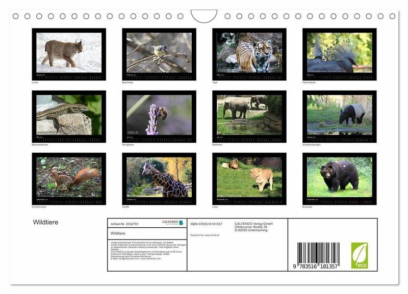 QUALITÄT - Hochwertiger Fotokalender mit 12 wunderschönen Motiven auf lichtbeständigem Bilderdruckpapier, robuste Spiralbindung mit Aufhängebügel.NACHHALTIG - deutliche Abfallreduzierung durch bedarfsgerechte Einzelstückfertigung, umweltfreundliches FSC-zertifiziertes Papier, Produktion in Deutschland, klimabewusste Logistik.PERFEKTES GESCHENK - Kalender für Freunde und Familie, für Kinder und Erwachsene, jung und alt, zu Weihnachten, Geburtstag oder zwischendurch.VIELFALT - Bildkalender in verschiedenen Formaten, z.B. DIN A5, DIN A4, DIN A3 sowie DIN A2. Ob Naturmotiv, Gemälde oder Fotos, ideal für ein persönliches Wohlfühlambiente.Wildtiere aus Nah und Fern von Autor(in): Claudia Knof-Hartmann