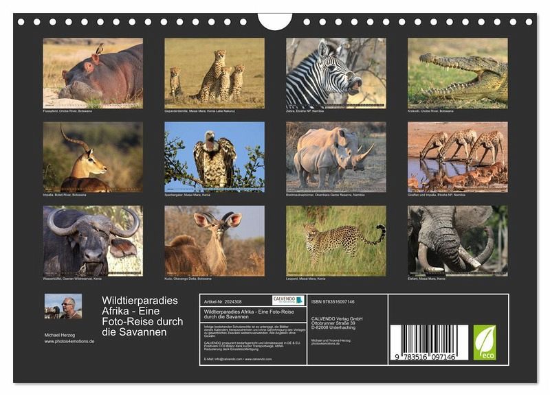 QUALITÄT - Hochwertiger Fotokalender mit 12 wunderschönen Motiven auf lichtbeständigem Bilderdruckpapier, robuste Spiralbindung mit Aufhängebügel.NACHHALTIG - deutliche Abfallreduzierung durch bedarfsgerechte Einzelstückfertigung, umweltfreundliches FSC-zertifiziertes Papier, Produktion in Deutschland, klimabewusste Logistik.PERFEKTES GESCHENK- Kalender für Freunde und Familie, für Kinder und Erwachsene, jung und alt, zu Weihnachten, Geburtstag oder zwischendurch.VIELFALT - Bildkalender in verschiedenen Formaten, z.B. DIN A5, DIN A4, DIN A3 sowie DIN A2. Ob Naturmotiv, Gemälde oder Fotos, ideal für ein persönliches Wohlfühlambiente.Wildtiere Afrikas in ihrem natürlichen Lebensraum von Autor(in): Michael Herzog