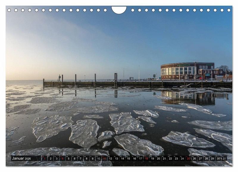 Die Stadt Wilhelmshaven an der deutschen Nordseeküste bietet viele maritime Motive zu jeder Jahreszeit: Eisschollen im Hafen, die Kaiser-Wilhelm-Brücke im Sonnenuntergang, beeindruckende Traditionssegler im Hafen, farbenprächtige Sonnenaufgänge am Molenfeuer - das sind nur einige der Bilder, die durch das Jahr begleiten.