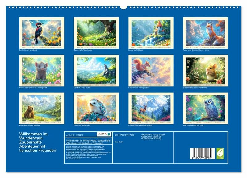 Dieser Kalender entführt Kinder auf eine magische Reise durch liebliche Waldlandschaften. Jeder Monat zeigt eine neue, farbenfrohe Szene, in der freundliche Tiere die Hauptrolle spielen. Die zauberhaften Bilder wurden mit Hilfe von KI erstellt und kombinieren Natur und Fantasie und regen die kindliche Vorstellungskraft an. Erleben Sie gemeinsam mit Ihren Kindern ein Jahr voller Abenteuer und Magie in einer liebevoll gestalteten Welt.
