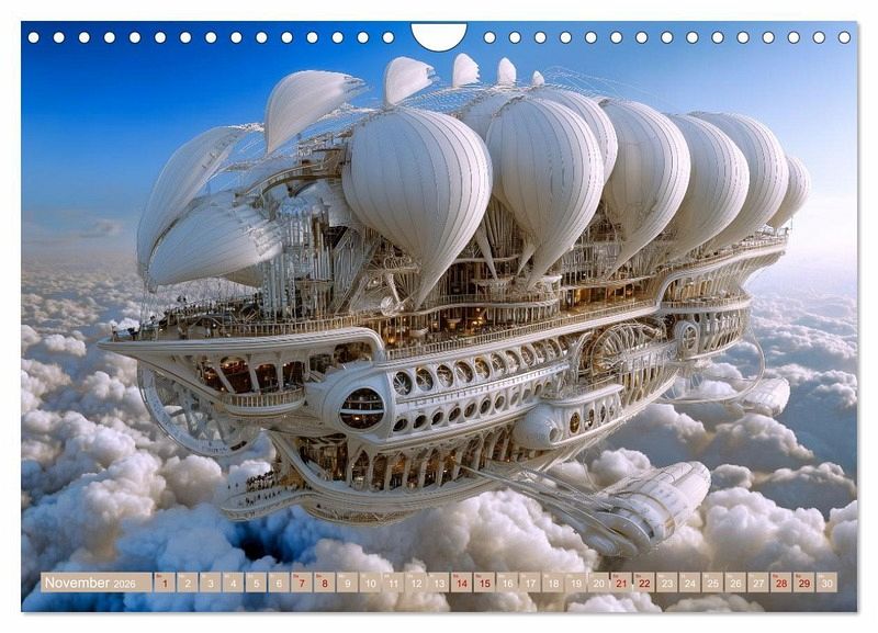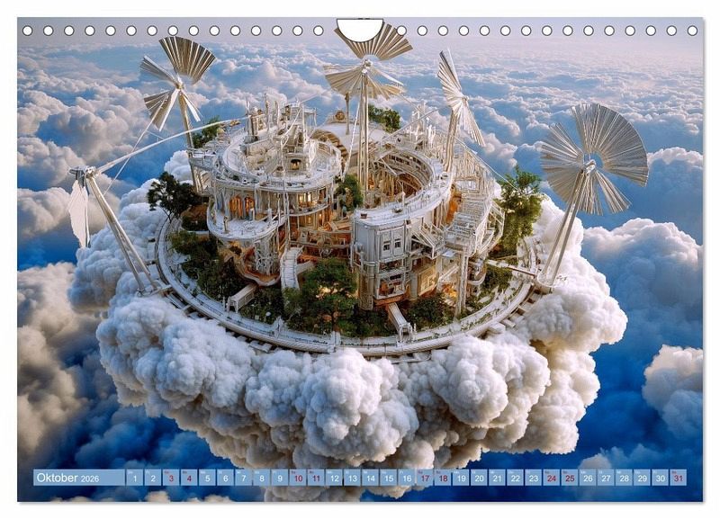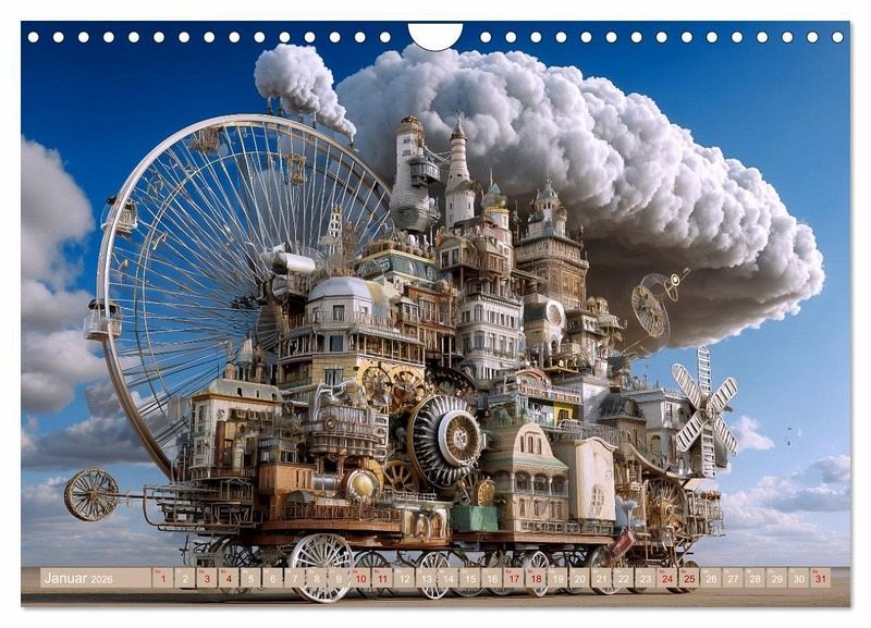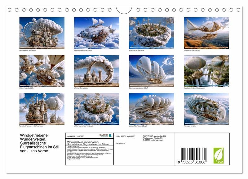 Windkraft trifft Fantasie: Lassen Sie sich Monat für Monat bezaubern von traumhaft schönen Maschinenwelten zwischen Himmel und Erde - inspiriert von Jules Verne, Steampunk und Science-Fiction. KI-generierte Motive zeigen majestätische Luftschiffe mit Segeln, Windrädern und mechanischen Antrieben, schwebende Städte, fliegende Windinseln und andere surreale Konstrukte. Jedes Bild steckt voller Bewegung, Detailliebe und technischer Eleganz.