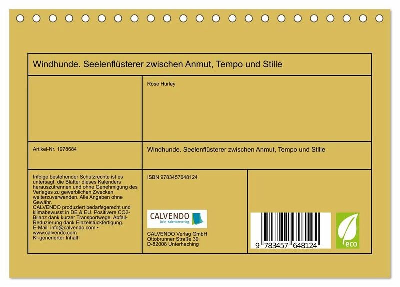 QUALITÄT - Hochwertiger Fotokalender mit 12 wunderschönen Motiven auf lichtbeständigem Bilderdruckpapier, robuste Spiralbindung.NACHHALTIG - deutliche Abfallreduzierung durch bedarfsgerechte Einzelstückfertigung, umweltfreundliches FSC-zertifiziertes Papier, Produktion in Deutschland, klimabewusste Logistik.PERFEKTES GESCHENK - Kalender für Freunde und Familie, für Kinder und Erwachsene, jung und alt, zu Weihnachten, Geburtstag oder zwischendurch.VIELFALT - Bildkalender in verschiedenen Formaten, z.B. DIN A5, DIN A4, DIN A3 sowie DIN A2. Ob Naturmotiv, Gemälde oder Fotos, ideal für ein persönliches Wohlfühlambiente.Windhunde in Momenten voller Kraft, Ruhe und natürlicher Schönheit von Autor(in): Rose Hurley