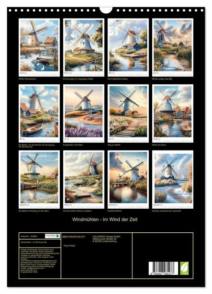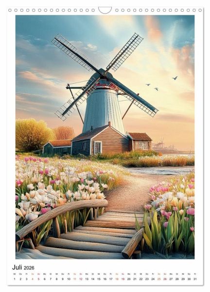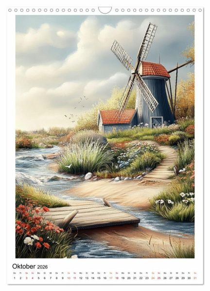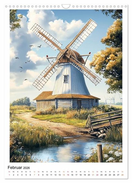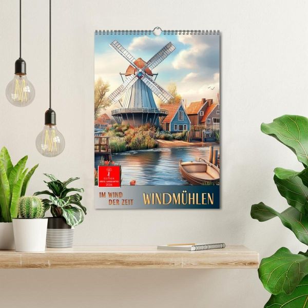Sanft drehen sich die Flügel von Windmühlen im Spiel von Licht und Schatten, während zarte Pastellfarben die Zeit einfangen - mal ein Hauch von Sommer, mal ein stiller Wintertraum. Monat für Monat werden Sie entführt in eine neue Szene - liebevoll und kunstvoll von KI-Bildern kreiert - in eine Welt voller Ruhe und Nostalgie. Einst unentbehrlich für das Mahlen von Getreide und ein Sinnbild für die Versorgung der Bevölkerung, prägten sie über Jahrhunderte das Landschaftsbild. Ob malerische Windmühlen an verträumten Bächen und schimmernden Kanälen, in strahlendem Weiß vor blauem Himmel oder romantisch eingebettet in eine verschneite Landschaft - jeden Monat entdecken Sie eine neue malerische Mühle.