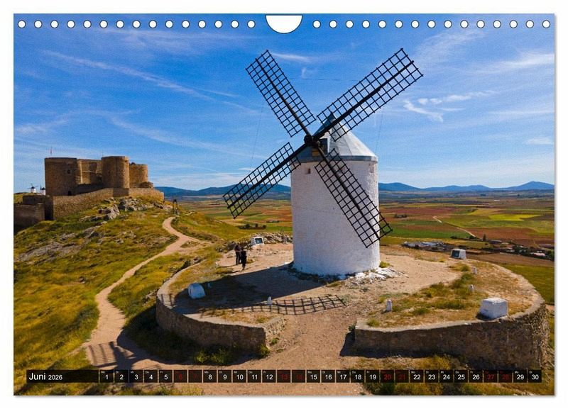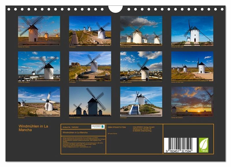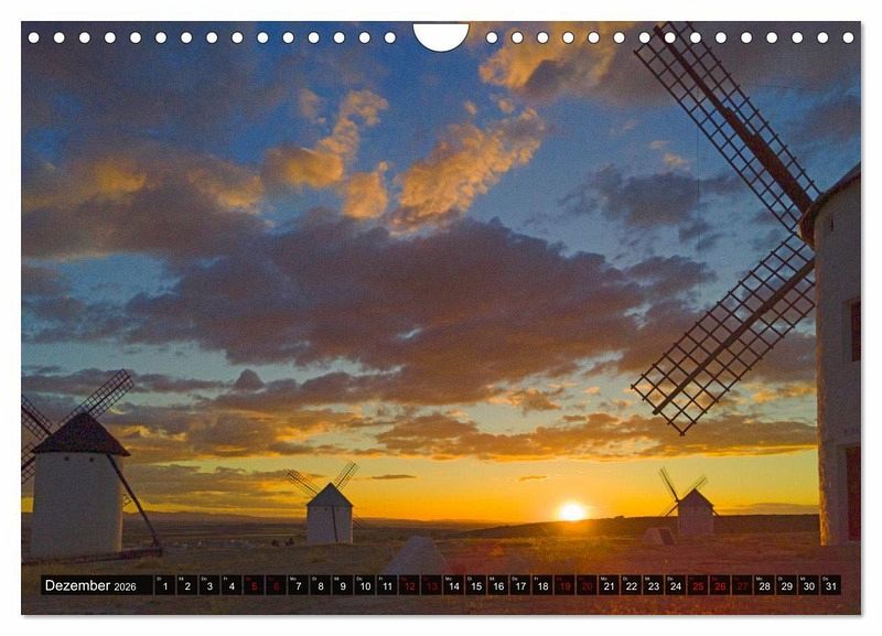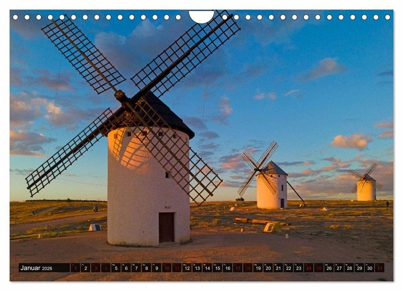 Tauchen Sie ein in die atemberaubende Landschaft Spaniens mit unserem exklusiven Kalender, der die legendären weißen Windmühlen von La Mancha feiert. Jede Seite entführt Sie in eine Welt der Tradition und zeitlosen Schönheit, die diese ikonischen Windmühlen verkörpern.