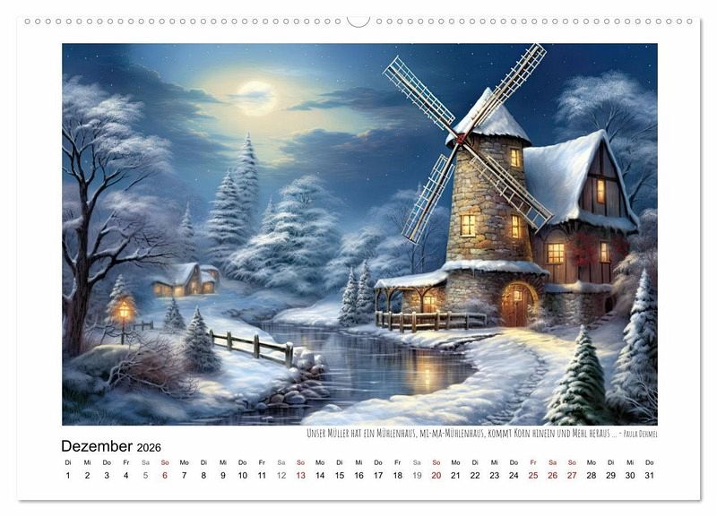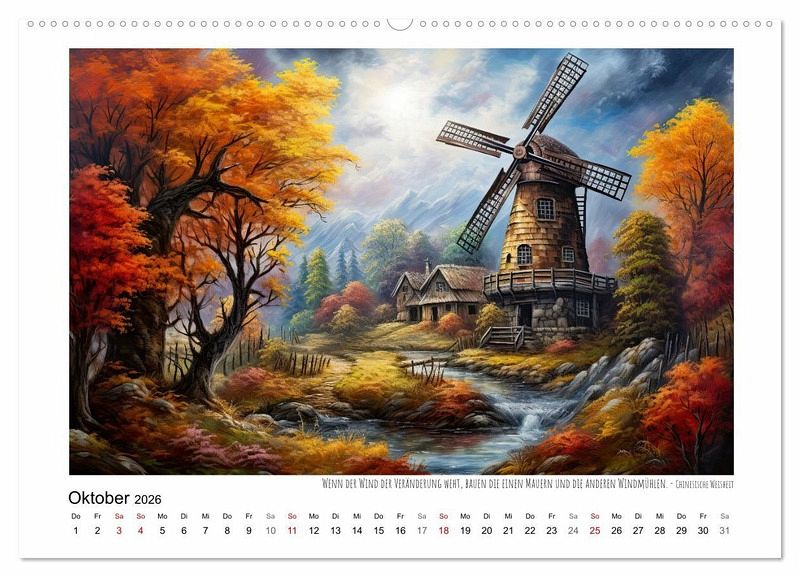 Sie haben den Charme vergangener Zeiten und nehmen uns mit auf eine Zeitreise: Windmühlen, anziehend und geheimnisvoll. In Deutschland wurden sie bereits im 14. Jahrhundert gebaut und dienten vornehmlich zum Mahlen von Mehl. Freuen Sie sich Monat für Monat auf ein zauberhaftes KI-Gemälde einer Windmühle in jahreszeitlich passender Landschaft und ein Zitat zu Windmühle, Wind und Mehl.