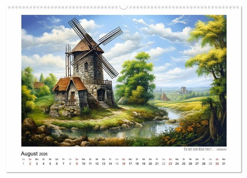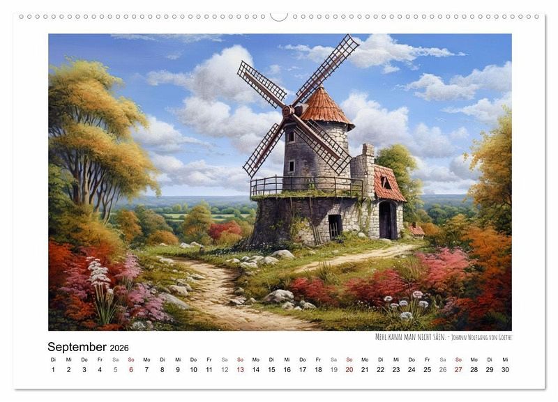 Sie haben den Charme vergangener Zeiten und nehmen uns mit auf eine Zeitreise: Windmühlen, anziehend und geheimnisvoll. In Deutschland wurden sie bereits im 14. Jahrhundert gebaut und dienten vornehmlich zum Mahlen von Mehl. Freuen Sie sich Monat für Monat auf ein zauberhaftes KI-Gemälde einer Windmühle in jahreszeitlich passender Landschaft und ein Zitat zu Windmühle, Wind und Mehl.