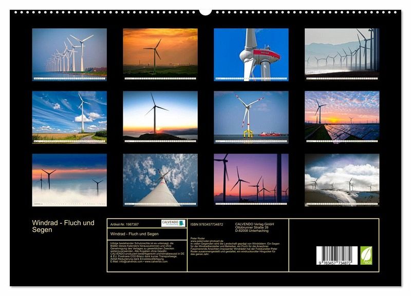 In vielen Gegenden wird die Landschaft geprägt von Windrädern. Ein Segen für die Windradhersteller und Betreiber, ein Fluch für die Anwohner. Faszinierende Ansichten imposanter Windräder hat der Fotokünstler Peter Roder zusammengestellt und gestaltet, ein eindrucksvoller Hingucker für das ganze Jahr.