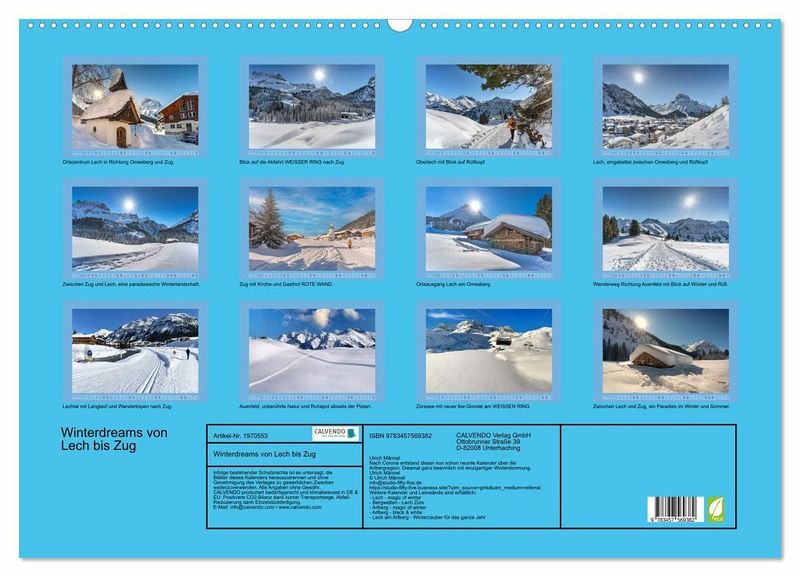 Lech als "Best of the Alps" bezeichnet, lockt seit über einem Jahrhundert Wintersportler und Urlauber aus aller Welt für fünf Monate zum Arlberg. Vom hochalpinen Tiefschneefahren bis zum Wandern in traumhafter Winterlandschaft, ist Genuss am Berg und im Schnee für alle garantiert. Der traumhafte Blick auf das AUENFELD und die RUHE im Zuger-TAL waren Anstoß für diesen neuen Kalender.