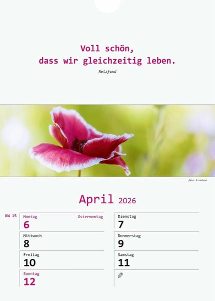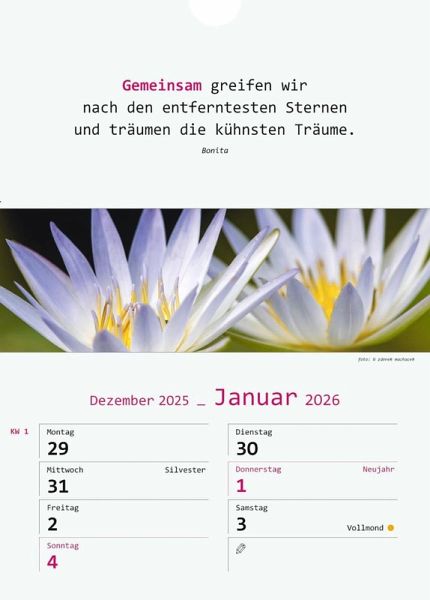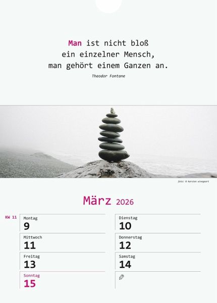 Für Zusammenhalt, Miteinander und Füreinander steht der neue Wir-Kalender 2026. Innere Stärke und Selbstliebe sind wichtige Voraussetzungen für ein erfülltes Leben, doch genauso spielen intakte Beziehungen, Freundschaften und Eingebundensein eine große Rolle für Glück und Wohlergehen. Soziale Beziehungen machen das Leben bunter und reichhaltiger. Füreinander da zu sein und miteinander etwas zu tun, macht Freude, gibt Energie, beflügelt und inspiriert. Sei es in einem losen Netzwerk von Gleichgesinnten, einem Verein, einer Gruppe oder durch ehrenamtliches Engagement. Dieser Kalender soll dazu anregen, gemeinsam, miteinander und füreinander zu handeln und durch mehr Verbundenheit zueinander zu finden.Klimafreundlich gedruckt mit Bio-Farben, Klimabeitrag und FSC-Label (Papier aus verantwortungsvollen Quellen).