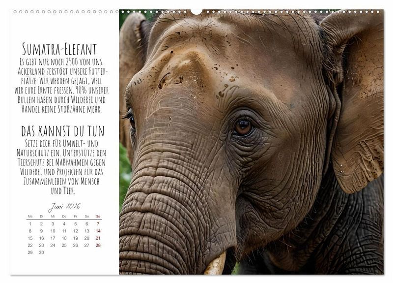 Entdecken Sie unseren bezaubernden Kalender mit KI-generierten Bildern von Jungtieren bedrohter Arten. Jeder Monat zeigt ein entzückendes Jungtier, gibt Einblick in die verbleibende Population und erklärt die Ursachen ihres Aussterbens. Erfahren Sie, wie Sie durch kleine, alltägliche Handlungen zum Schutz dieser gefährdeten Spezies beitragen können.