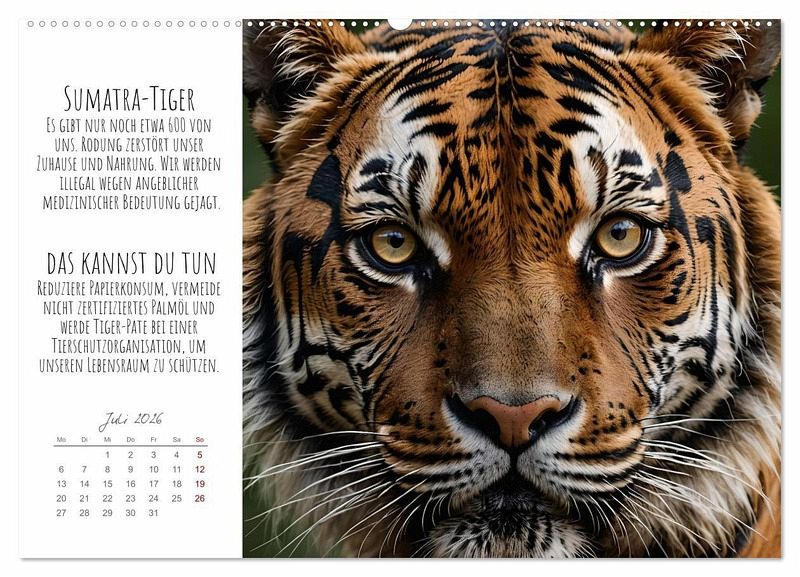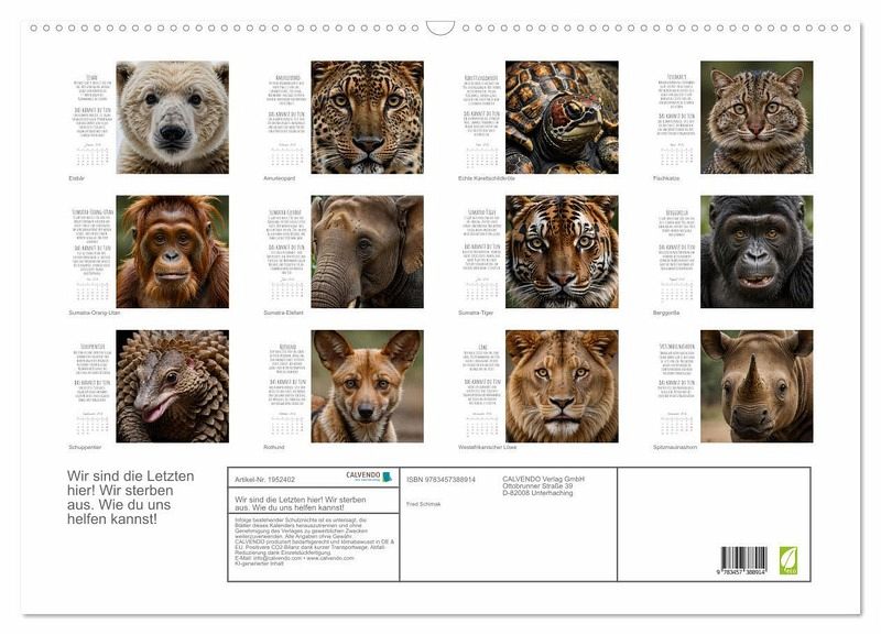 QUALITÄT - Hochwertiger Fotokalender mit 12 wunderschönen Motiven auf lichtbeständigem Bilderdruckpapier, robuste Spiralbindung mit Aufhängebügel.NACHHALTIG - deutliche Abfallreduzierung durch bedarfsgerechte Einzelstückfertigung, umweltfreundliches FSC-zertifiziertes Papier, Produktion in Deutschland, klimabewusste Logistik.PERFEKTES GESCHENK - Kalender für Freunde und Familie, für Kinder und Erwachsene, jung und alt, zu Weihnachten, Geburtstag oder zwischendurch.VIELFALT - Bildkalender in verschiedenen Formaten, z.B. DIN A5, DIN A4, DIN A3 sowie DIN A2. Ob Naturmotiv, Gemälde oder Fotos, ideal für ein persönliches Wohlfühlambiente.Vom Aussterben bedrohte Tiere und praktische Tipps, wie jeder Einzelne zum Schutz dieser Spezies beitragen kann. von Autor(in): Michaela Spreider