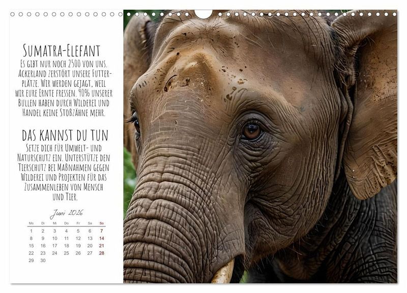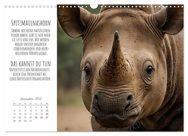 Entdecken Sie unseren bezaubernden Kalender mit KI-generierten Bildern von Jungtieren bedrohter Arten. Jeder Monat zeigt ein entzückendes Jungtier, gibt Einblick in die verbleibende Population und erklärt die Ursachen ihres Aussterbens. Erfahren Sie, wie Sie durch kleine, alltägliche Handlungen zum Schutz dieser gefährdeten Spezies beitragen können.