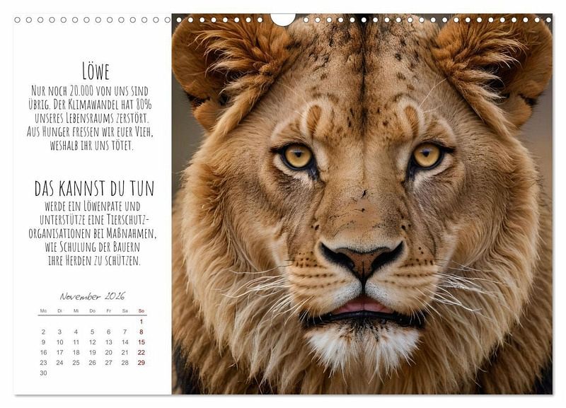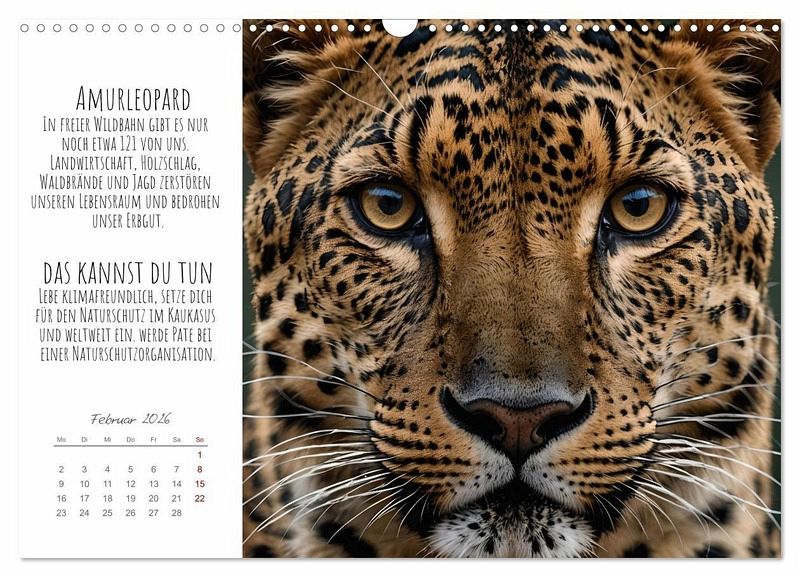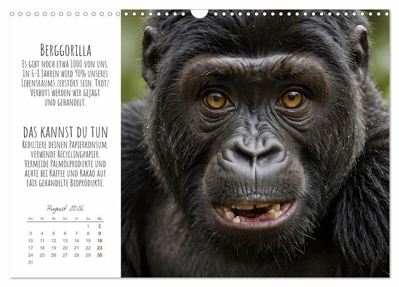 QUALITÄT - Hochwertiger Fotokalender mit 12 wunderschönen Motiven auf lichtbeständigem Bilderdruckpapier, robuste Spiralbindung mit Aufhängebügel.NACHHALTIG - deutliche Abfallreduzierung durch bedarfsgerechte Einzelstückfertigung, umweltfreundliches FSC-zertifiziertes Papier, Produktion in Deutschland, klimabewusste Logistik.PERFEKTES GESCHENK - Kalender für Freunde und Familie, für Kinder und Erwachsene, jung und alt, zu Weihnachten, Geburtstag oder zwischendurch.VIELFALT - Bildkalender in verschiedenen Formaten, z.B. DIN A5, DIN A4, DIN A3 sowie DIN A2. Ob Naturmotiv, Gemälde oder Fotos, ideal für ein persönliches Wohlfühlambiente.Vom Aussterben bedrohte Tiere und praktische Tipps, wie jeder Einzelne zum Schutz dieser Spezies beitragen kann. von Autor(in): Michaela Spreider