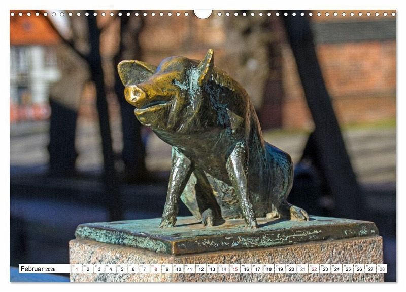 Februar: Eines der vier Schweinchen auf der Wismarer Schweinsbrücke