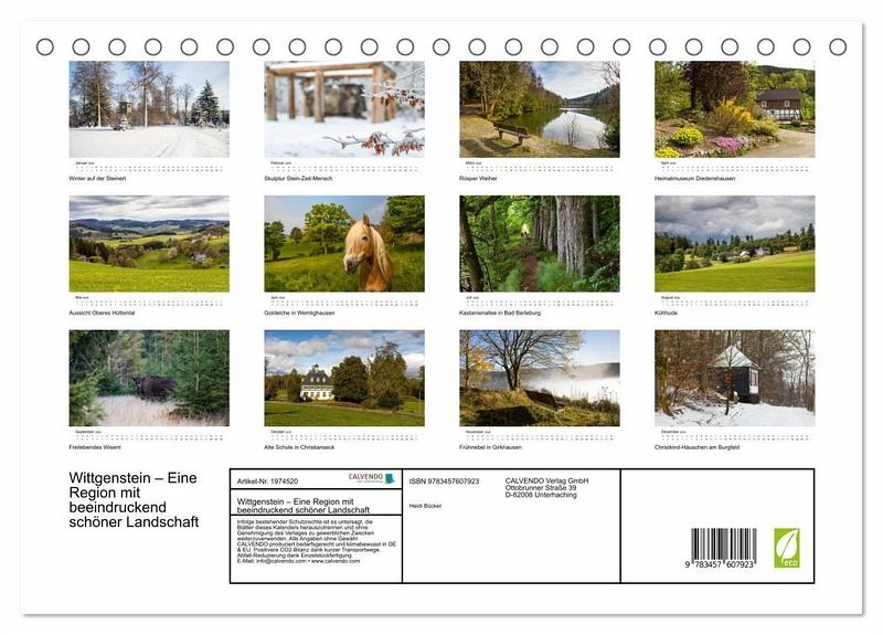 QUALITÄT - Hochwertiger Fotokalender mit 12 wunderschönen Motiven auf lichtbeständigem Bilderdruckpapier, robuste Spiralbindung.NACHHALTIG - deutliche Abfallreduzierung durch bedarfsgerechte Einzelstückfertigung, umweltfreundliches FSC-zertifiziertes Papier, Produktion in Deutschland, klimabewusste Logistik.PERFEKTES GESCHENK - Kalender für Freunde und Familie, für Kinder und Erwachsene, jung und alt, zu Weihnachten, Geburtstag oder zwischendurch.VIELFALT - Bildkalender in verschiedenen Formaten, z.B. DIN A5, DIN A4, DIN A3 sowie DIN A2. Ob Naturmotiv, Gemälde oder Fotos, ideal für ein persönliches Wohlfühlambiente.Die Region Wittgenstein ist ein Naturparadies in Südwestfalen von Autor(in): Heidi Bücker