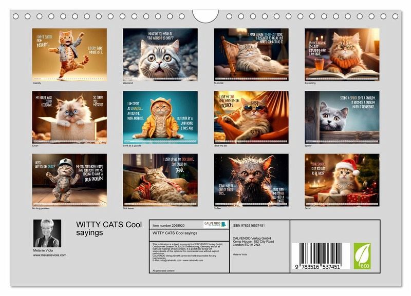 QUALITY - High-quality photo calendar with 12 beautiful images on light-resistant paper, robust spiral binding with hanger.SUSTAINABLE - Significant waste reduction due to print-on-demand production, environmentally friendly FSC-certified paper, produced in the UK, climate-conscious logistical processes.PERFECT GIFT - calendars for friends and family, for children, all ages and all occasions, from Christmas to birthdays and everything in between.LOTS OF CHOICE - Wall calendars in different sizes (DIN A4 and DIN A3), for any topic and personal taste, featuring photography, painting and illustrations.Cute furry friends with amusing quips, author: Melanie Viola