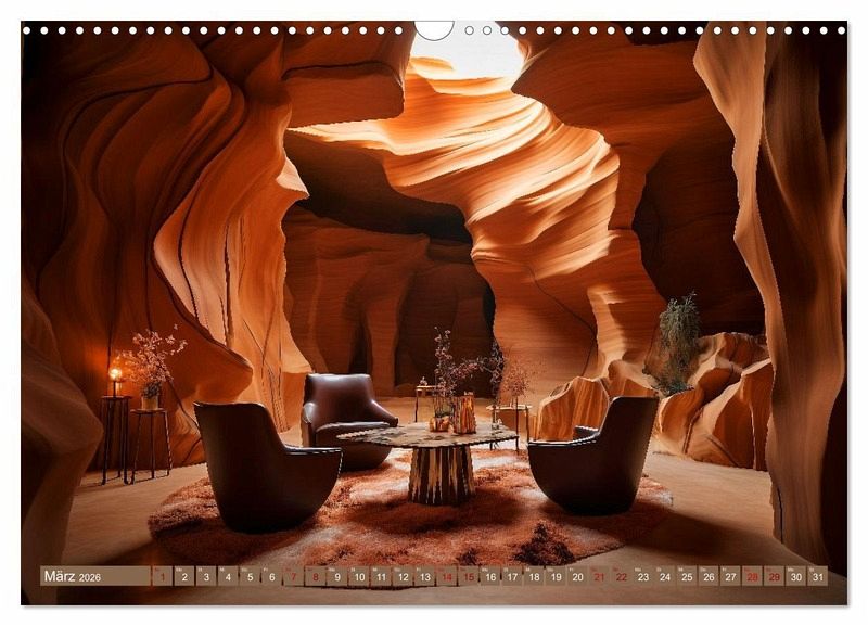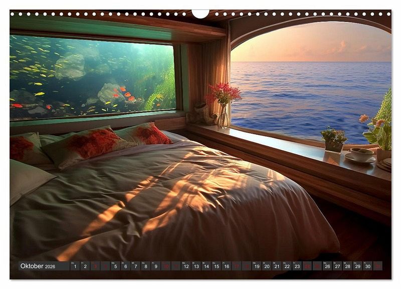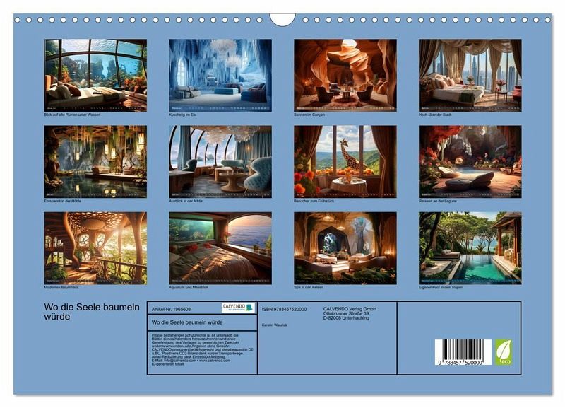 Wer möchte nicht gern mal Urlaub machen in einer Suite, die so richtig voller Luxus ist? Dieser Kalender zeigt zwölf fantasievolle Räume, in denen man sich gern entspannen möchte. Ob in Höhlen, kuschelig im Eis oder mit eigenem Pool und Aquarium... man könnte es sich wunderbar gut gehen lassen und die Seele könnte baumeln. Die Bilder wurden erstellt mit künstlicher Intelligenz und Photoshop