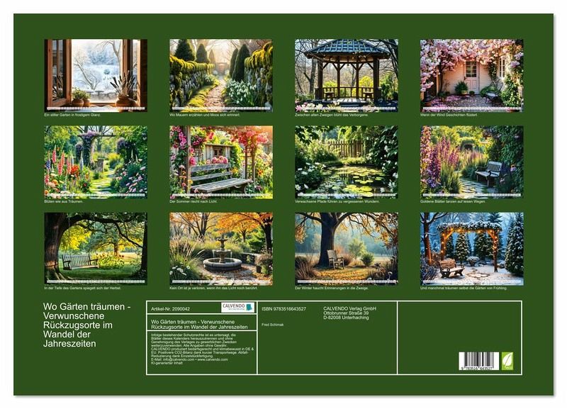 QUALITÄT - Hochwertiger Fotokalender mit 12 wunderschönen Motiven auf lichtbeständigem Bilderdruckpapier, robuste Spiralbindung mit Aufhängebügel.NACHHALTIG - deutliche Abfallreduzierung durch bedarfsgerechte Einzelstückfertigung, umweltfreundliches FSC-zertifiziertes Papier, Produktion in Deutschland, klimabewusste Logistik.PERFEKTES GESCHENK - Kalender für Freunde und Familie, für Kinder und Erwachsene, jung und alt, zu Weihnachten, Geburtstag oder zwischendurch.VIELFALT - Bildkalender in verschiedenen Formaten, z.B. DIN A5, DIN A4, DIN A3 sowie DIN A2. Ob Naturmotiv, Gemälde oder Fotos, ideal für ein persönliches Wohlfühlambiente.Magische Gärten im Jahreslauf von Autor(in): Michaela Spreider