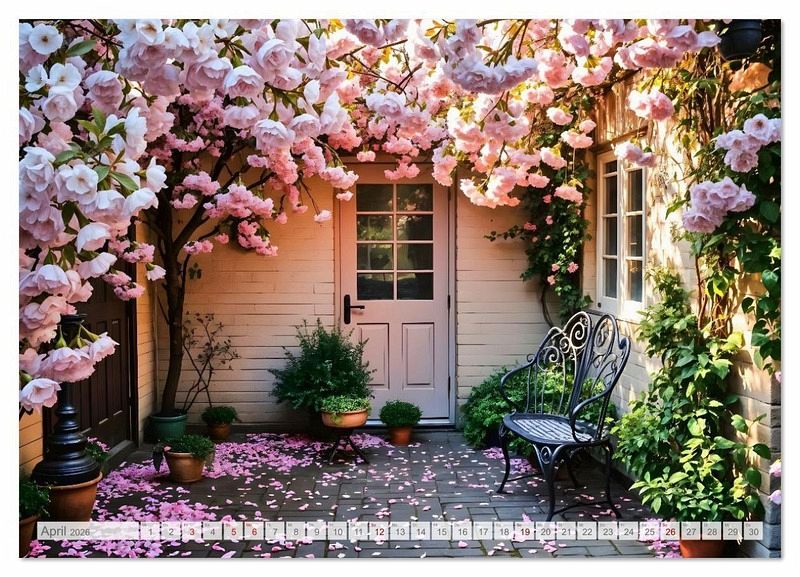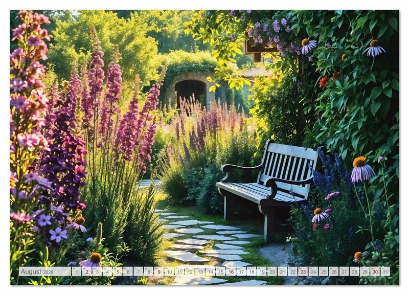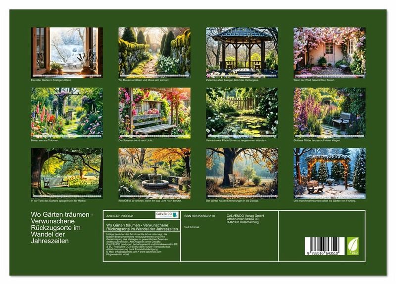 Ein Jahr voller stiller Sehnsucht, blühender Geheimnisse und vergessener Orte. Dieser romantische Kalender lädt ein zu einer Reise durch zwölf verträumte Gärten. Jeder von ihnen verborgen, verzaubert, ein Rückzugsort im Wandel der Jahreszeiten. Die poetischen Bildwelten wurden mit Hilfe künstlicher Intelligenz erschaffen und erzählen von Stille, Schönheit und der Magie des Unentdeckten. Ein visueller Spaziergang für die Seele, für alle, die das Flüstern der Natur lieben.