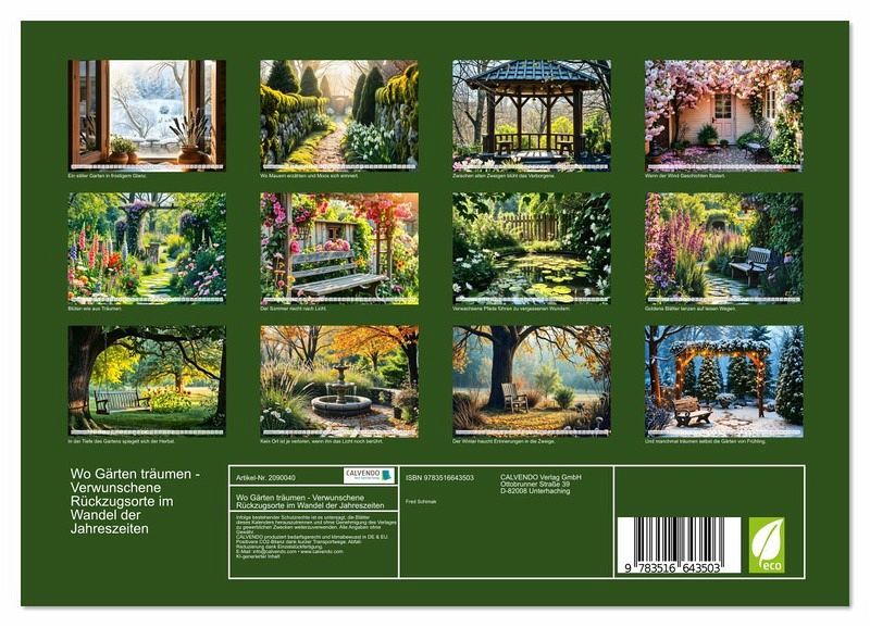 QUALITÄT - Hochwertiger Fotokalender mit 12 wunderschönen Motiven auf lichtbeständigem Bilderdruckpapier, robuste Spiralbindung mit Aufhängebügel.NACHHALTIG - deutliche Abfallreduzierung durch bedarfsgerechte Einzelstückfertigung, umweltfreundliches FSC-zertifiziertes Papier, Produktion in Deutschland, klimabewusste Logistik.PERFEKTES GESCHENK - Kalender für Freunde und Familie, für Kinder und Erwachsene, jung und alt, zu Weihnachten, Geburtstag oder zwischendurch.VIELFALT - Bildkalender in verschiedenen Formaten, z.B. DIN A5, DIN A4, DIN A3 sowie DIN A2. Ob Naturmotiv, Gemälde oder Fotos, ideal für ein persönliches Wohlfühlambiente.Magische Gärten im Jahreslauf von Autor(in): Michaela Spreider