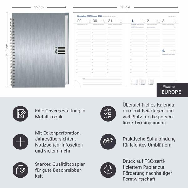 - Der treue Begleiter für 365 Tage voller Möglichkeiten: Dieser elegante Taschenplaner 2026 mit stabilem Aluoptik-Hardcover in Silber passt perfekt in jede Handtasche- Organisieren mit Stil: Der Buchkalender im Format A5 mit silbernem Einband vereint Terminübersicht mit edlem Design- Jahresübersicht, Platz für Notizen und ein praktisches Wochenkalendarium: Dieser Taschenkalender ist die perfekte Organisationshilfe für den Alltag- Von Arztterminen bis zur Reiseplanung: Behalten Sie den Überblick mit dem Cheftimer in strahlendem Silber- Notieren, planen, organisieren: ein Kinderspiel mit den Buchkalendern von Heye aus dem Athesia Kalenderverlag!Sprachen: Deutsch, Englisch, Italienisch