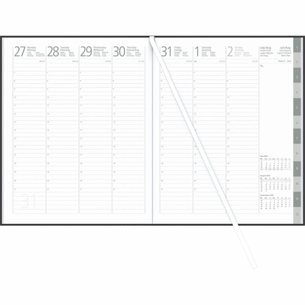 Wochenbuch Typ 739 im großzügigen Format 21 x 26,5 cm128 Seiten mit 1 Woche auf 2 Seiten klar strukturiert und übersichtlichMonatsregisterschnitt für schnelles NachschlagenSonn- und Feiertage hervorgehoben, inkl. Tages-, Wochen- und ArbeitstagezählungÜbersichtliches Kalendarium mit DreimonatsansichtPraktisches Telefon- und AdressverzeichnisStundeneinteilung von 7 21 Uhr für präzise Tagesplanung8-sprachiges Kalendarium: DE, GB, FR, IT, ES, PL, NL, RUHochwertige Fadensiegelung, robust und langlebigEinband aus wattiertem Kunststoff mit edler LeinenprägungFSC-zertifiziert nachhaltig produziertMit praktischem Leseband für schnellen Zugriff